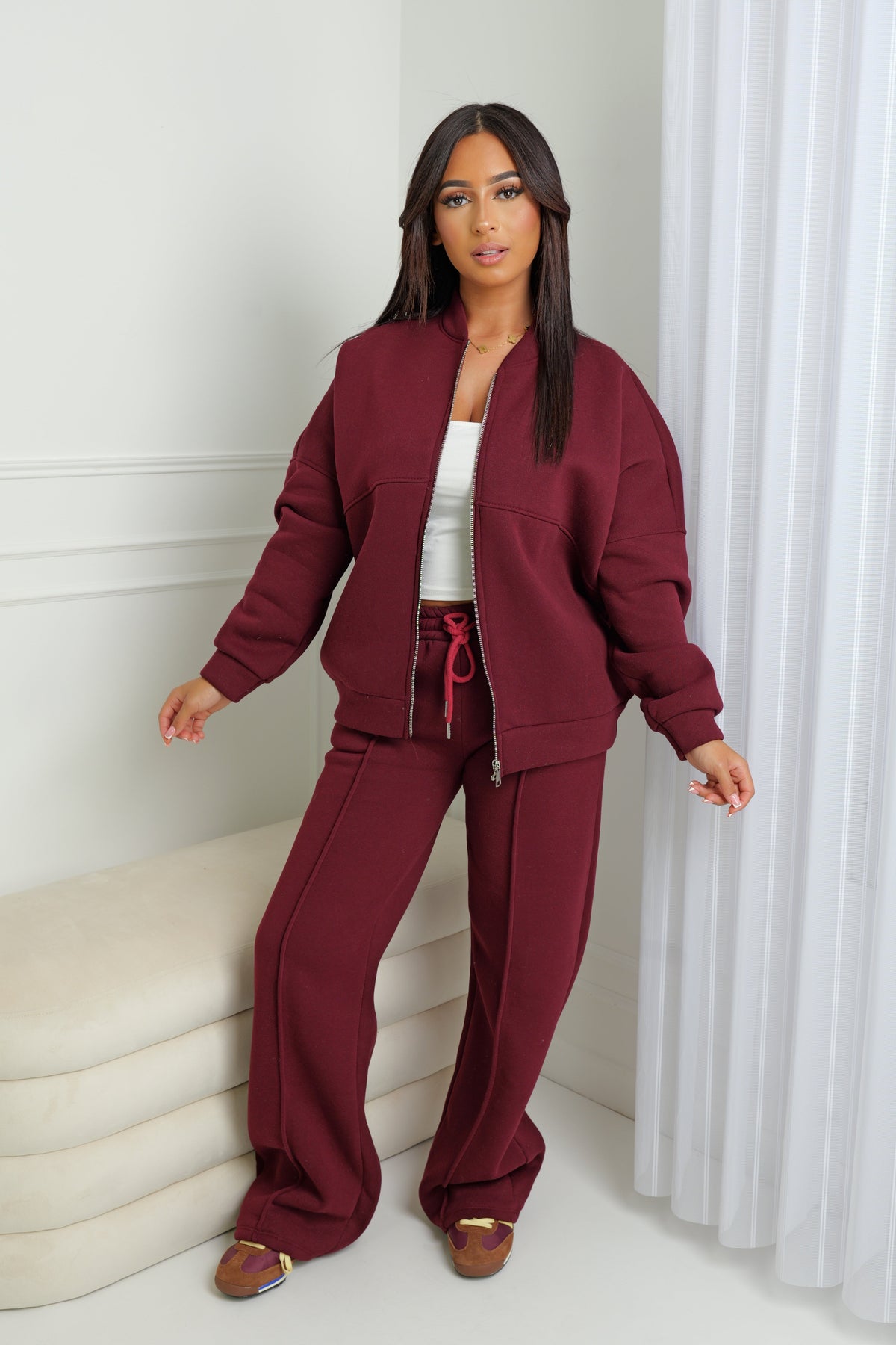 Conçu dans un tissu doux et duveteux, cet ensemble de jogging combine une coupe large et structurée avec un look minimaliste et raffiné. Sa veste zippée avec col droit et son pantalon à taille élastique avec cordon de serrage assurent une silhouette à la fois décontractée et élégante.